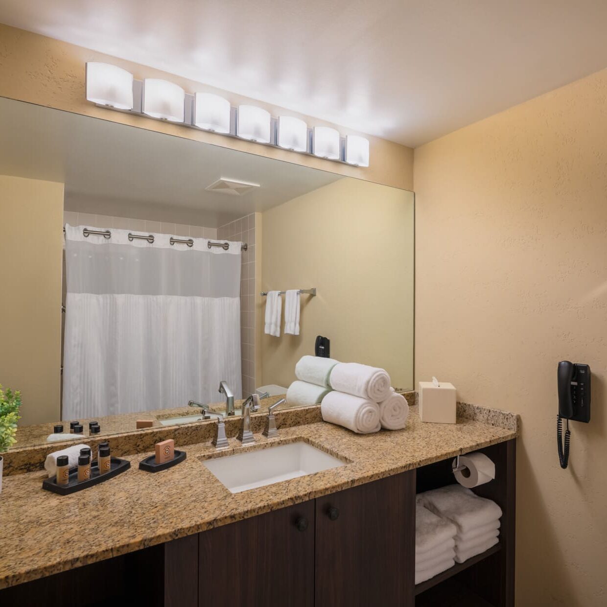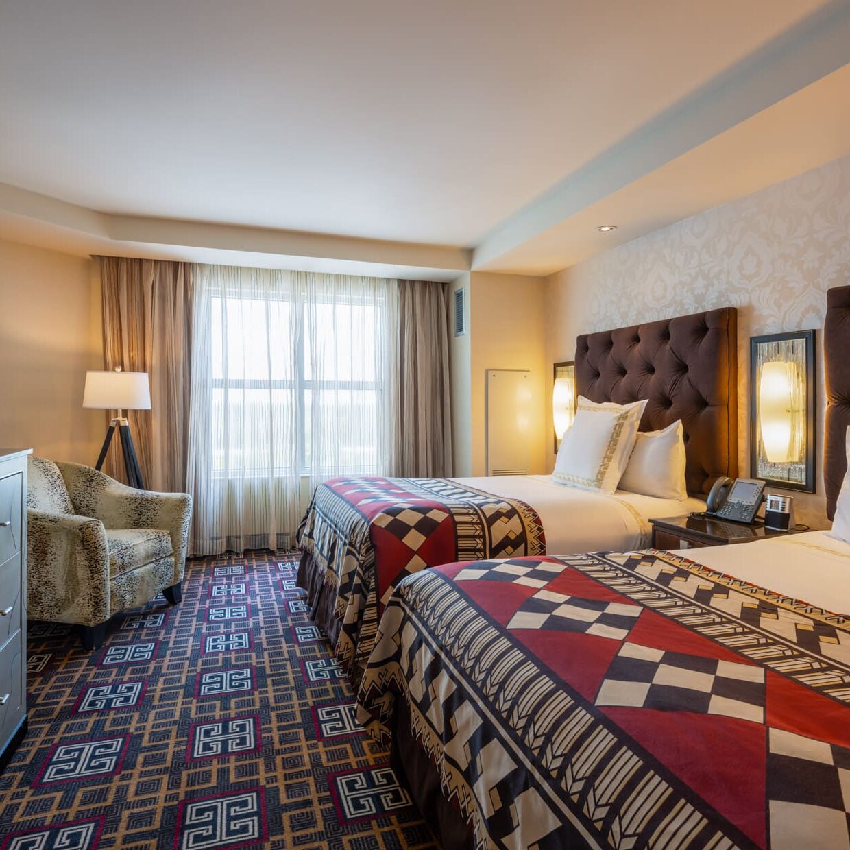 This spacious suite features two queen beds and a living area with a sleeper sofa, 65" TV, refrigerator, microwave, and plush seating for guests to gather and celebrate the night.